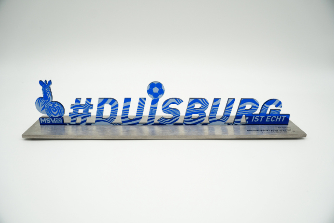 MSV-Fans aufgepasst! Wer seine Liebe zum Meidericher Spielverein und zu Duisburg stilvoll in Szene setzen möchte, hat jetzt die perfekte Gelegenheit dazu. Unsere beliebte DUISBURG IST ECHT-Schriftskulptur im MSV-Design gibt es ab sofort als Magnet und als hochwertigen Tischaufsteller – zwei exklusive Highlights für echte Zebras!